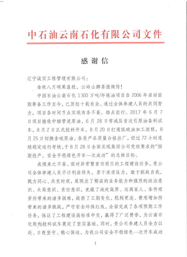 我公司于今日收到由中國(guó)石油云南石化有限公司發(fā)給我方的《感謝信》一封,信中提到:對(duì)于我方所監(jiān)理服務(wù)的煉油項(xiàng)目自2006年啟動(dòng)籌備工作至今,我方監(jiān)理人員不計(jì)利益得失,勇于承受壓力,使得該項(xiàng)目近日順利投產(chǎn)試車成功。對(duì)于我單位的工作給予極大的肯定以及衷心的感謝。對(duì)方還提到:希望雙方在日后的共同發(fā)展中,互惠互利,共贏發(fā)展。