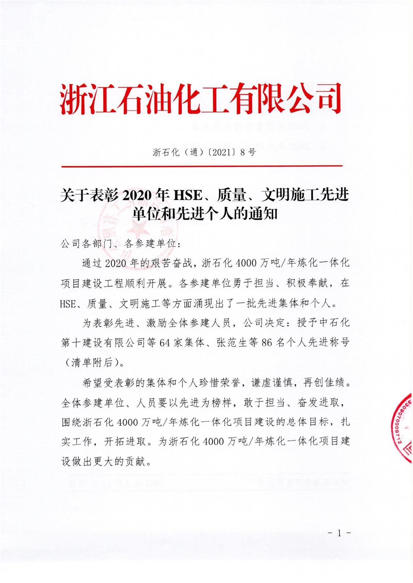 熱烈祝賀沈志強(qiáng)同志榮獲浙江石油化工有限公司4000萬(wàn)噸/年煉化一體化項(xiàng)目“質(zhì)量管理先進(jìn)個(gè)人”榮譽(yù)稱號(hào)