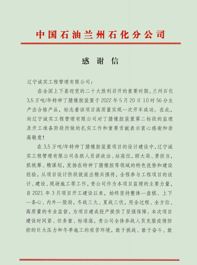 近日,由我公司監(jiān)理的中國(guó)石油天然氣股份有限公司蘭州石化分公司--3.5萬(wàn)砘/年特種丁腈橡膠項(xiàng)目喜獲業(yè)主表?yè)P(yáng)信。表?yè)P(yáng)信充分肯定了誠(chéng)實(shí)監(jiān)理的工作成果,對(duì)駐蘭州項(xiàng)目部全體監(jiān)理工程師在項(xiàng)目建設(shè)過(guò)程中所付出的努力表示由衷的感謝。