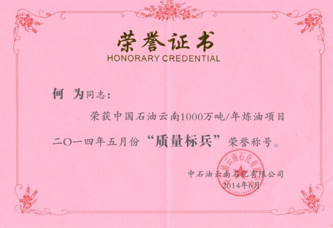 表彰:云南項(xiàng)目部何為同志榮獲中國(guó)石油云南1000萬(wàn)噸/年煉油項(xiàng)目2014年5月份“質(zhì)量標(biāo)兵“榮譽(yù)稱(chēng)號(hào)