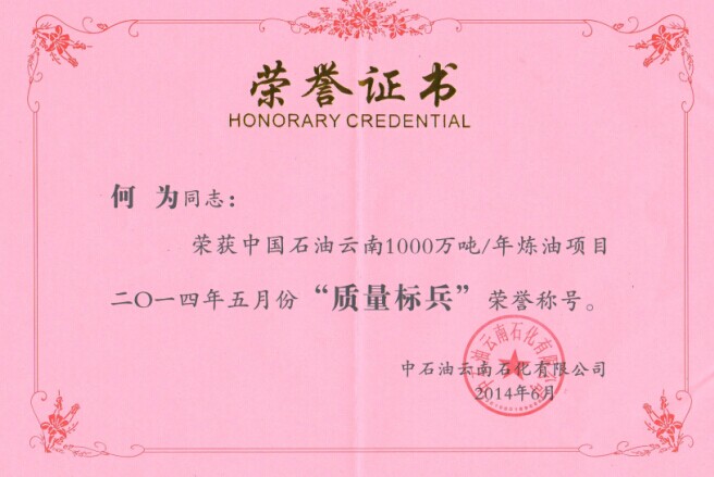 云南項目部何為同志榮獲中國石油云南1000萬噸/年煉油項目2014年5月份“質(zhì)量標兵“榮譽稱號